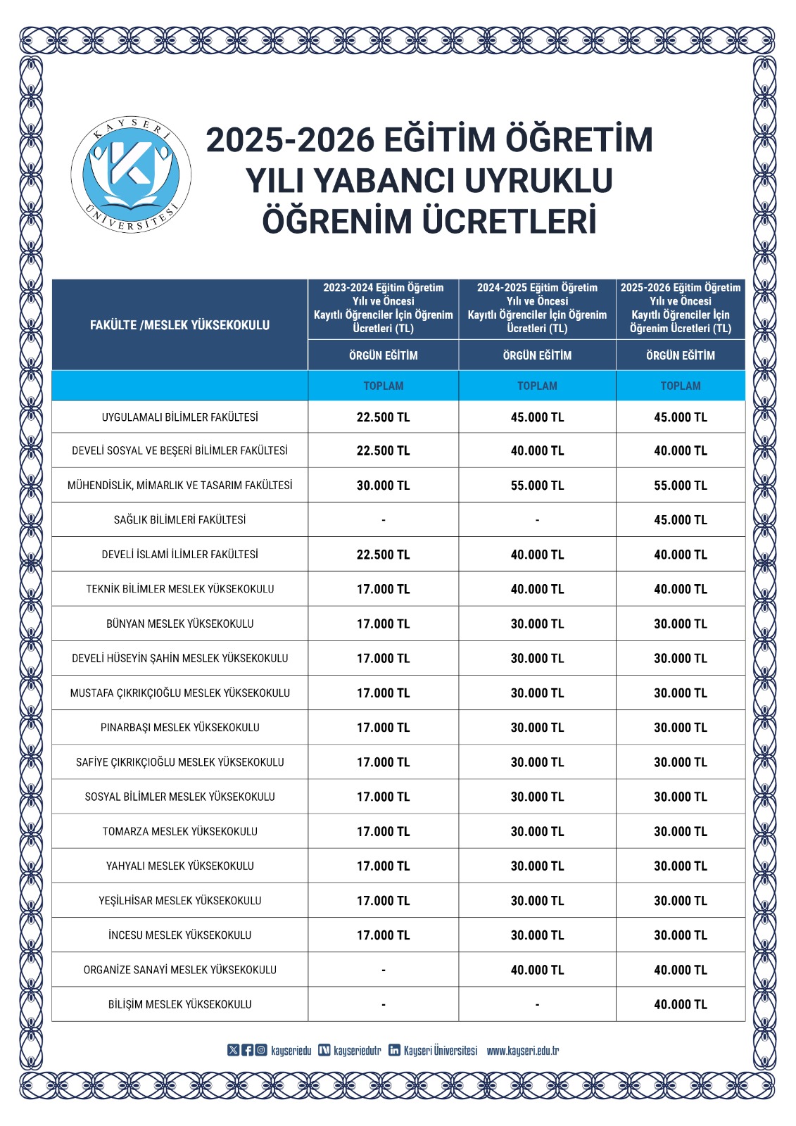 2025-2026 Eğitim Öğretim Yılının Katkı Payları ve Öğrenim Ücretleri